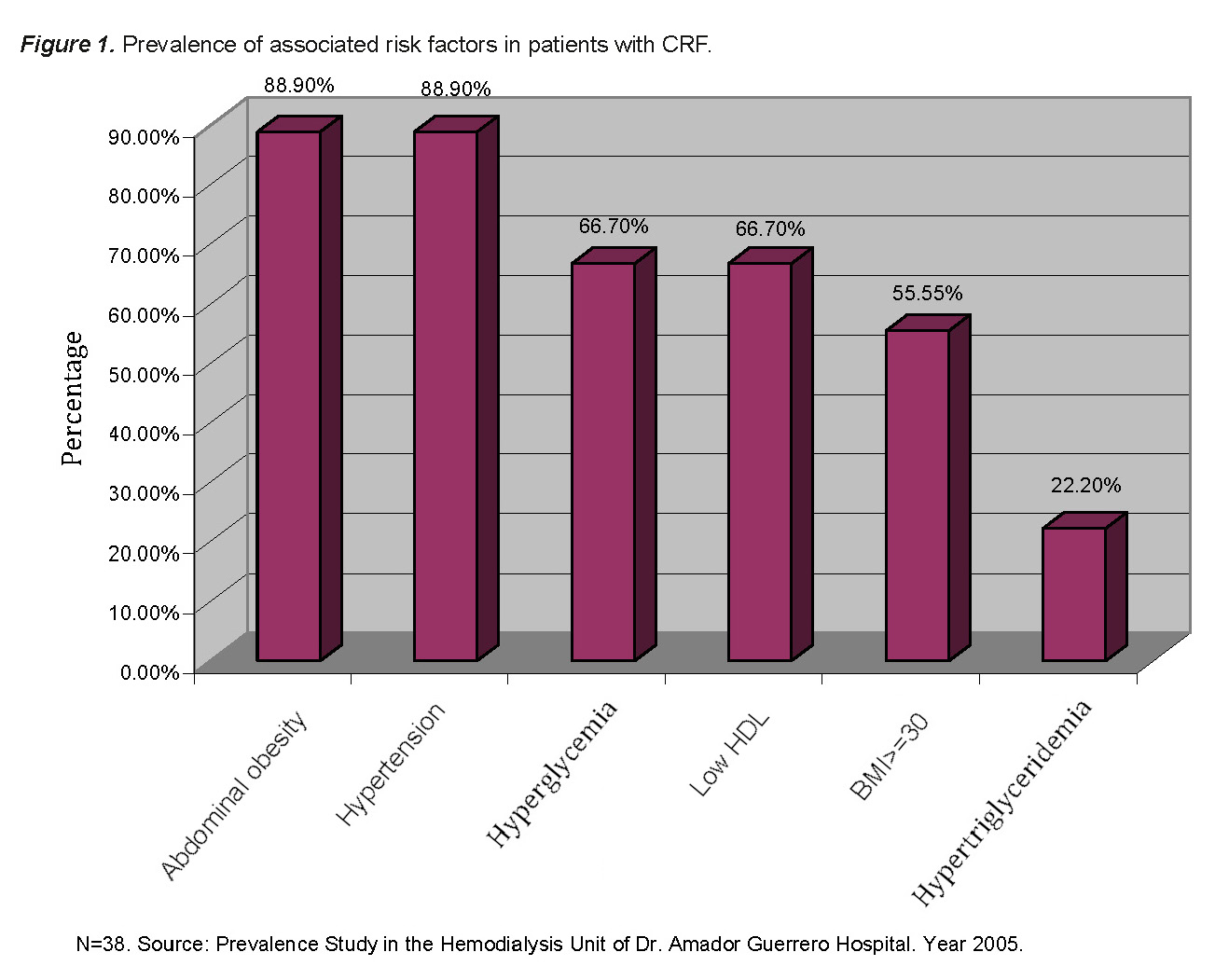 Introducción: El síndrome metabólico X (SMX) agrupa factores de riesgo como obesidad abdominal, hipertensión, dislipidemia y resistencia a la insulina, los cuales incrementan significativamente la morbimortalidad cardiovascular. En pacientes con insuficiencia renal crónica (IRC), la presencia de SMX es aún más relevante, pues acelera la progresión de la enfermedad y aumenta las complicaciones cardiovasculares. Se realizó un estudio retrospectivo, descriptivo, en el cual se evaluó a los pacientes atendidos en la Unidad de Hemodiálisis del Hospital Dr. Amador Guerrero, y se cuantificó la presencia de factores de riesgos cardiovasculares y los componentes del síndrome metabólico (SMX). Justificacaión: El síndrome metabólico es altamente prevalente en pacientes con insuficiencia renal crónica y aumenta el riesgo cardiovascular, por lo que su identificación es clave para mejorar el pronóstico clínico. Metodología: Se estudiaron pacientes con insuficiencia renal crónica en diálisis en la provincia de Colón durante 2005. Se registraron datos antropométricos y de laboratorio, y el síndrome metabólico se diagnosticó según criterios NCEP/ATP III (2005). El análisis se realizó con EPI-INFO 6.0. Resultados: Se observó una prevalencia de 23.7% de pacientes con SMX atendidos en la unidad. De estos pacientes, un 88.9% presentaban obesidad abdominal e hipertensión arterial. Sin embargo, sólo la obesidad abdominal y la resistencia a la insulina (medida como hiperglicemia en ayunas) fueron estadísticamente significativas para la presencia de SMX en los pacientes con IRC. Se reportó un OR de 38.4 (IC 95%: 3.88–379.70, p<0.05) y 6.28 (IC 95%: 1.23–31.95, p<0.05) respectivamente. Conclusión: La prevalencia del SMX en la población estudiada fue de 23.7%. La obesidad abdominal y la resistencia a la insulina aumentan significativamente la probabilidad de presentar SMX. Además, la evidencia actual sugiere que existen variantes genéticas que predisponen al desarrollo del SMX en pacientes con insuficiencia renal, lo que abre nuevas perspectivas de investigación.